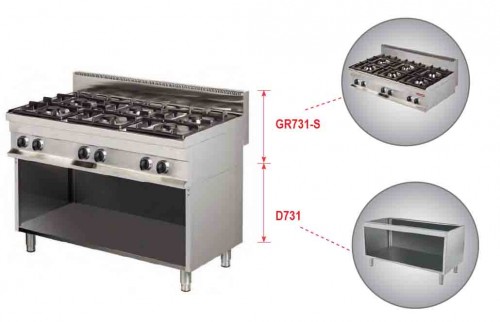 GR731 | Masina de gatit cu 6 focuri pe suport neutru deschis, flacara dubla, flacara pilot, valva de siguranta cu termocupla, alimentare gaz, putere 6 x 6 kW, 3,75 m3/h, consum gaz butelie 2,82 kg/h, greutate 95 kg | 1200x700x900 (mm) | cere pret |