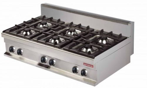 GR731-S | Masina de gatit cu 6 focuri de banc, flacara dubla, flacara de veghe, alimentare gaz, putere 6 x 6 kW, consum gaz retea 3,75 m3/h, consum gaz butelie 2,82 kg/h, greutate 68 kg, valva de siguranta si termocupla, aprindere piezoelectrica greutate 68 kg | 1200x700x290 (mm) | cere pret |