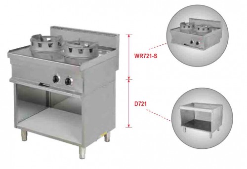 WR721 | Masina de gatit Wok cu 2 focuri pe suport, alimentare gaz, putere 2x16 kW, consum gaz retea 2.5m3/h; consum gaz butelie 1.88kg/h; prevazuta cu valva de siguranta si termocupla, greutate 64 kg | 800x700x920 (mm) | cere pret |
