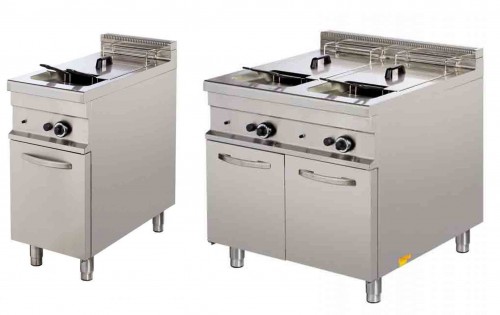 GF922 | Friteusa alimentare gaz, 2 cuve pe suport neutru inchis, 2x20 litri/cuva, putere 2x15kW, control temperatura prin termostat, dispozitiv pentru scurgerea uleiului, consum gaz retea 3,13 m3/h, consum gaz butelie 2,35 kg/h, greutate 100 kg | 850x900x900 (mm) | 4190 € |