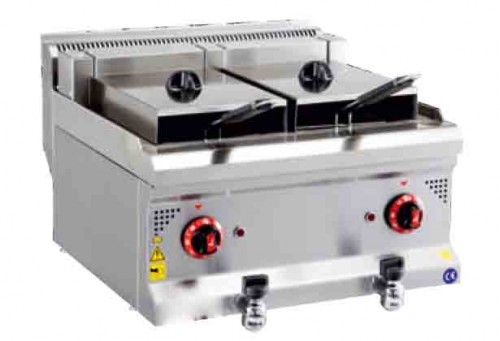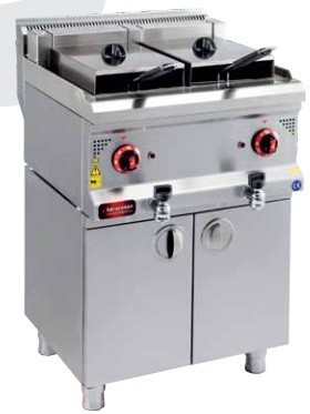 | KRCS-DFE660 | Friteuza inox electrica cu 2 cuve pe suport inchis cu 2 usi batante; Capacitate 9+9 litri, Putere 15 kW, robinet de scurgere a uleiului; structura din inox; are termostat de lucru si termostat de siguranta; alimentare 380V V/50 Hz, prevazuta cu indicator luminos de pornit/oprit; greutate 52 kg | 600x600x850 mm | 1375 € |