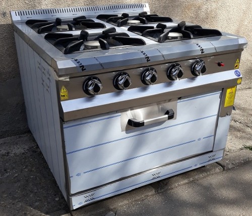 Masina de gatit cu 4 focuri si cuptor, alimentare gaz, arzatoare cu flacara, valva de siguranta cu termocupla, putere 36,5kW (4x7,5kW+ 6,5kW), greutate 113 kg