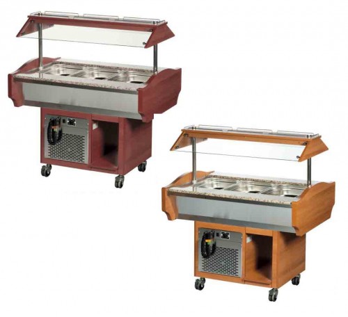 Vitrina rece pentru bufet, capacitate 3 GN 1/1, cadru si suport imitatie lemn (culoare - mahon/nuc), top granit, Temperatura 2 - 10 grad C, Putere 550 W, alimentare 220V, racire statica, polita superioara prevazuta cu lumina, Greutate 167 Kg |