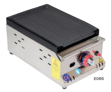 E085 | Gratar structura inox, cu placa de coacere din fonta cu suprafata striata, putere 2,5 kW, alimentare gaz, greutate 18 kg | 300x510x200 | 800 lei |