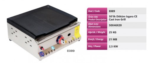 E089 | Gratar structura inox, cu placa de coacere din fonta cu suprafata 1/2 neteda si 1/2 striata, putere 2,5 kW, alimentare gaz, greutate 25 kg | 500x460x200 | 1000 lei |