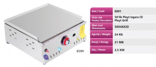 E091 | Gratar structura inox, cu placa de coacere din otel grosime 5 mm cu suprafata neteda, putere 2,5 kW, alimentare gaz, greutate 24 kg | 500x460x200 | 860 lei |