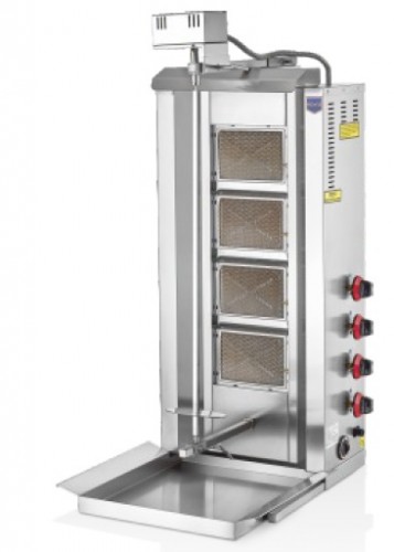| D08(M) | Aparat shaorma pe gaz, 4 elementi incalzire cu motor sus, valva protectie gaz, putere 13KW, capacitate 50 Kg, viteza de rotatie 2,5 rpm, inaltime tepuse 95 cm, greutate 26 kg | 540x640x1200 mm | 550 € |